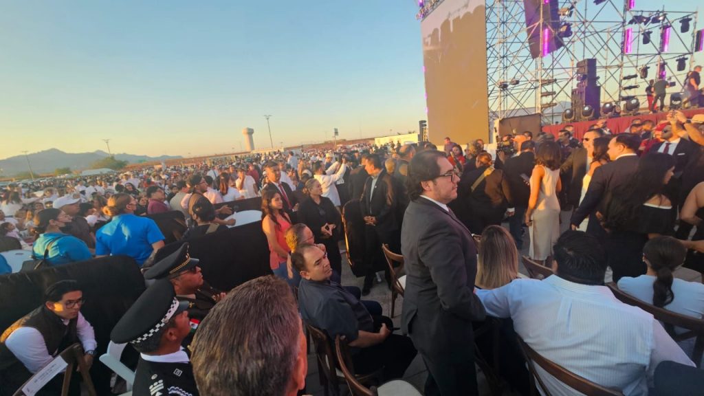 En una plaza abarrotada, también se dio cita, en representación de la gobernadora Maru Campos el Secretario de Seguridad Pública Estatal, Gilberto Loya y en la representación federal lo acompañó la Secretaria del Bienestar, Adriana Montiel, el General de la Zona militar y la Guardia Nacional entre otras autoridades.