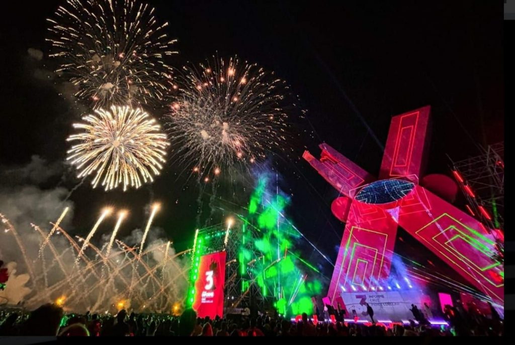 El evento fue coronado con un espectáculo de drones y de luces láser sobre la escultura de la emblemática Equis.