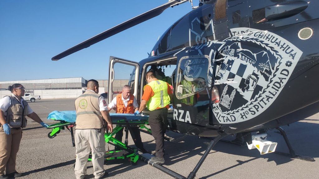 La aeronave aterrizó en la explanada de la Deportiva Sur en la ciudad de Chihuahua, donde paramédicos de la Unidad de Rescate del Gobierno del Estado (URGE) recibieron al paciente para trasladarlo vía terrestre al nosocomio.