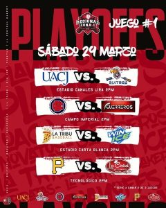 A su vez, en el Campo Imperial, los sublíderes Guerreros (8-1) se medirán a los Novatos de la Liga Paso del Norte (3-6) en la serie entre el número dos y el siete.