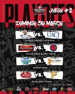 Series a ganar dos de tres juegos: Buitres vs Indios; Guerreros vs Paso del Norte; Win Ice vs La Tribu y Central Bakery vs Tec de Juárez