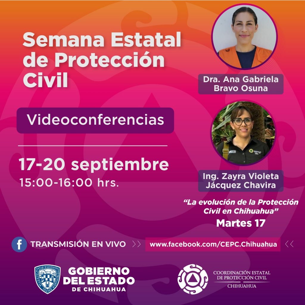 Las incluyen temas como: “La evolución actual de Protección Civil en el estado de Chihuahua”, el martes 17; “Manejo y uso del gas LP y gas natural”, el miércoles 18; “La sismicidad en el estado de Chihuahua”, el jueves 19 y “Las sequías y las ondas de calor: ¿Qué complicaciones surgen para pronosticar su origen?, el viernes 20”.