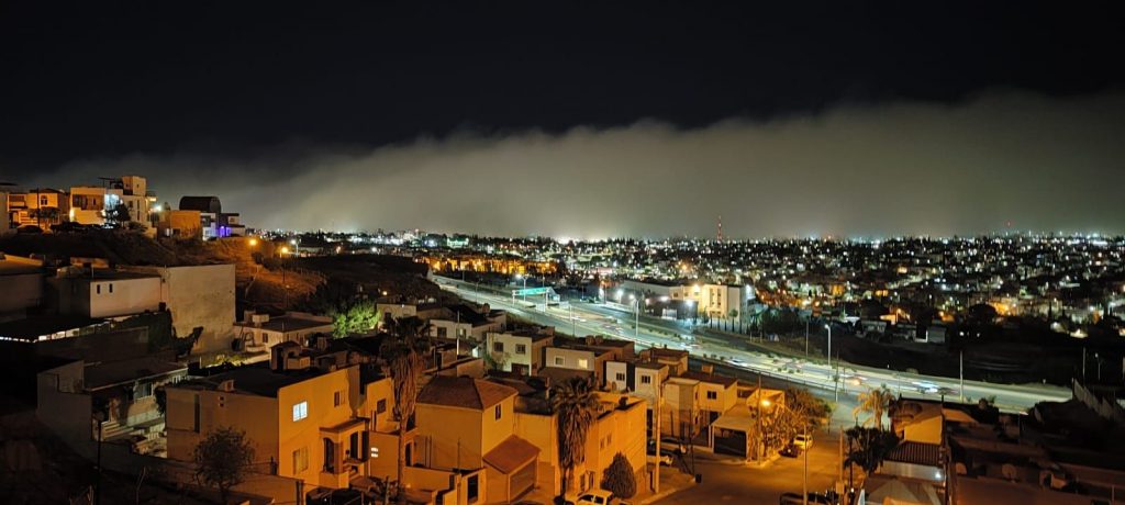 A su paso por la capital, la tolvanera de ayer fue captada en una vista nocturna por el lente fotográfico de Gabriel Cardona, donde se pueden apreciar los resplandecientes polvos iluminados por las luces de la ciudad.
