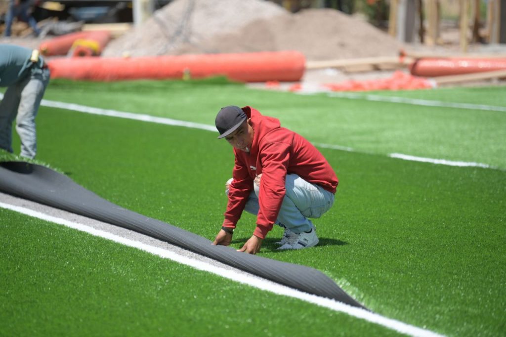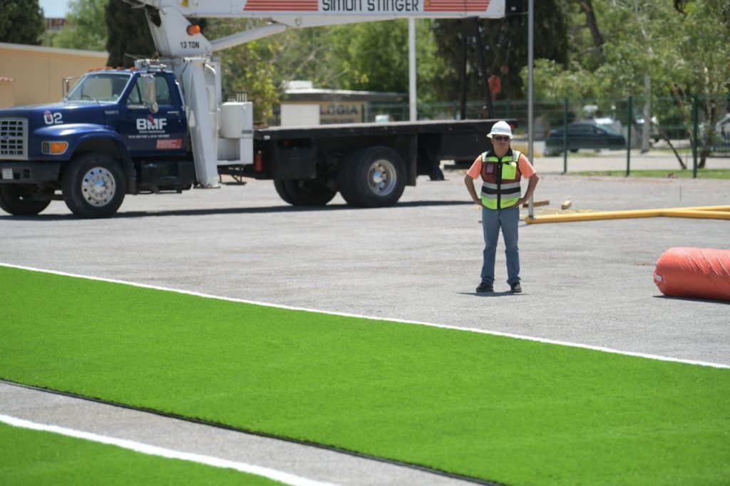 Consta de 7 mil 100 metros de pasto sintético, una sub-base de dos mil 500 metros cúbicos, una impregnación de 7 mil 480 metros y se cuenta con drenajes pluviales para evitar inundaciones.