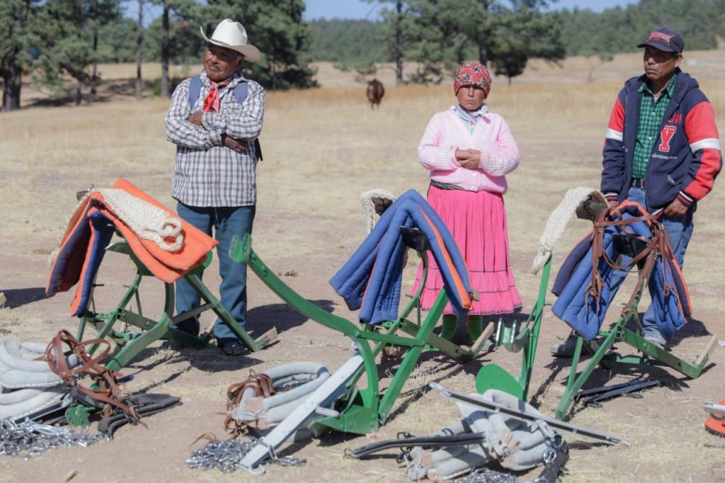 Asimismo, en Guachochi se entregaron 200 paquetes de insumos básicos como maíz y frijol, equipos para la implementación de huertos, paquetes de especies menores para corrales avícolas, herramientas, aperos de labranza y material para la producción de composta.