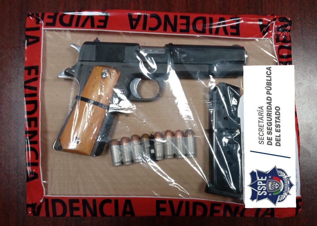 La Fuerza Especial SWAT de la Secretaría de Seguridad Pública del Estado (SSPE), detuvo en flagrancia a un hombre de 26 años, identificado como Fidel Onofre G. C., quien portaba consigo un arma de fuego calibre .45, abastecida con 8 cartuchos útiles, además de provocar un accidente vial tras persecución.