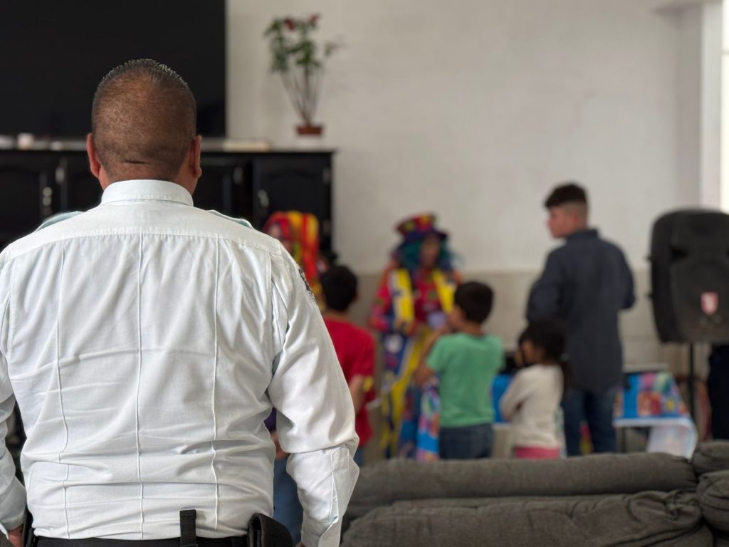 Durante la visita, elementos de la Policía Estatal organizaron un convivio que incluyó la entrega de pizzas, un show de payasos y figuras de globos, con el objetivo de brindar un momento de alegría y celebración a las infancias en un ambiente seguro y cálido.