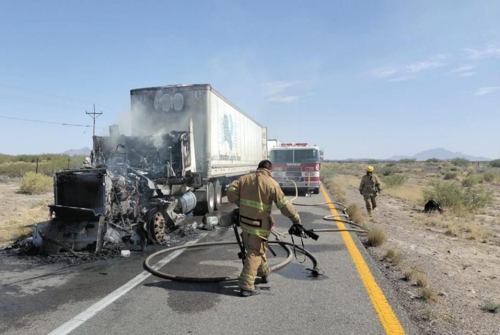 Elementos de la Guardia Nacional, cerraron el sentido norte a sur de la carretera Ciudad Juárez-Ahumada, debido al incendio en la cabina de un tractocamión, ocurrido a la altura del kilómetro 260, informó la Coordinación Estatal de Protección Civil (CEPC).