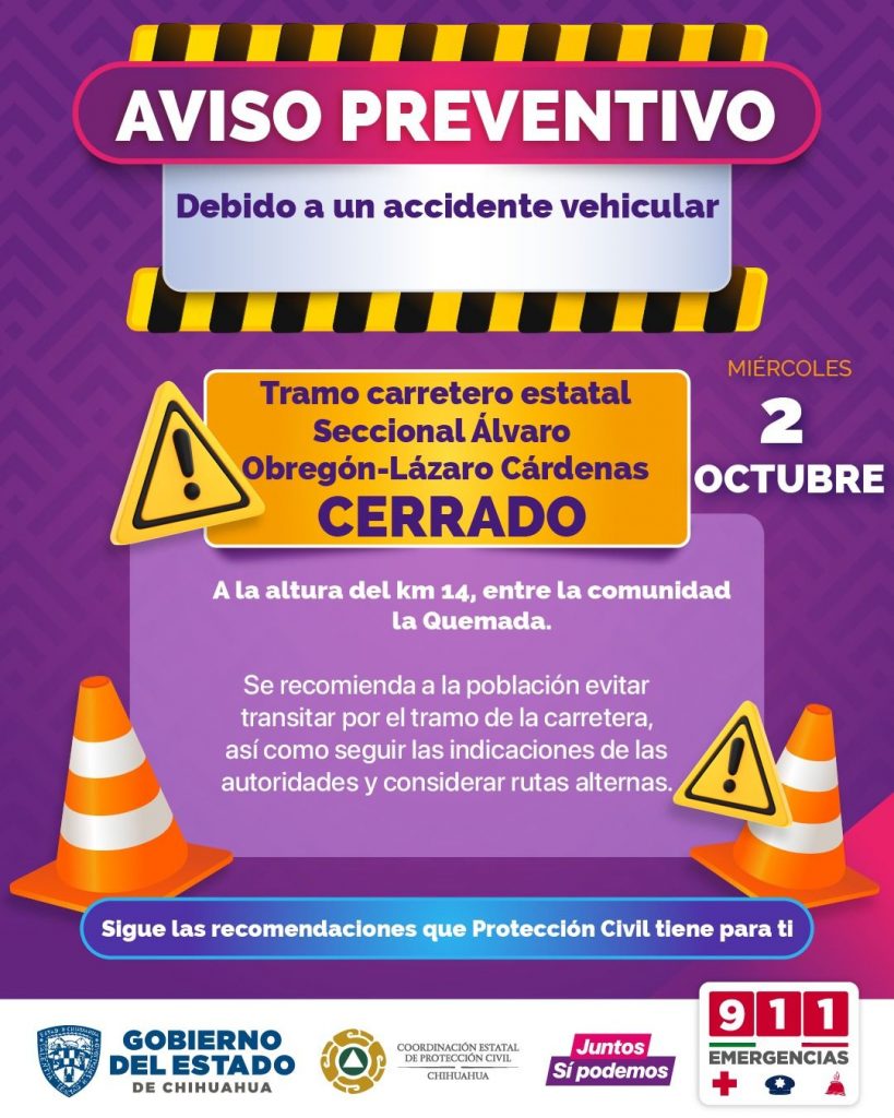 La Coordinación Estatal de Protección Civil (CEPC) informa el cierre parcial de la carretera Rubio-Lázaro Cárdenas en su sentido de sur a norte, a la altura 13+900 de la vía que comunica a la colonia Vianna, en el municipio de Cuauhtémoc, debido a la fuga de combustible derivado de la volcadura de un camión cisterna.