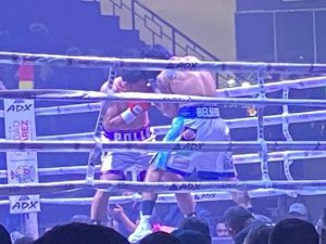 Con el ‘Muñeco’ contra las cuerdas, el centroamericano, conectó varios golpes consecutivos al boxeador del fraccionamiento San Lorenzo que no dañaron a Belman.