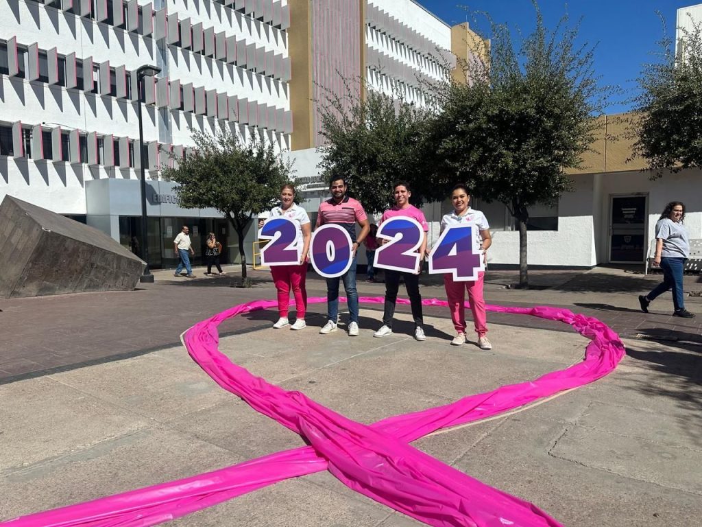 En la formación de este moño simbólico participaron derechohabientes, enfermeras, químicos, médicos y personal administrativo vestidos con camisetas color rosa de las diversas áreas de la institución, quienes se congregaron en la Plaza de la Salud de PCE.