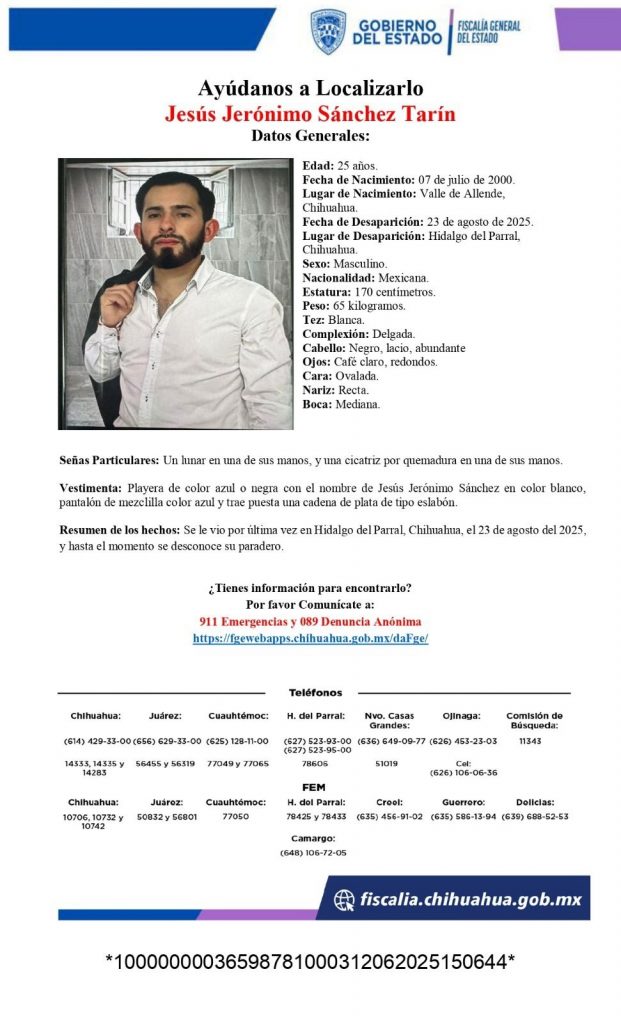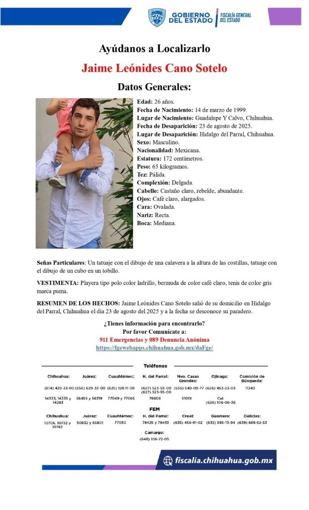 La Fiscalía de Distrito Zona Sur, a través de la Unidad Especializada en Investigación de Personas No Localizadas y Desaparecidas, continúa con los trabajos de búsqueda para dar con el paradero de Jaime Leónides Cano Sotelo y Jesús Jerónimo Sánchez Tarín, reportados como desaparecidos el 23 de agosto del presente año en la ciudad de Parral.