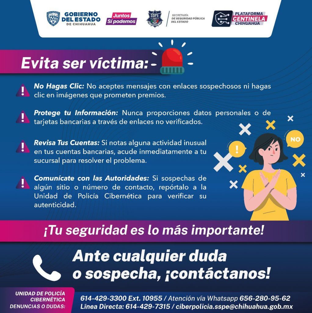 También se puede establecer contacto en el correo electrónico pen ciberpolicia.sspe@chihuahua.gob.mx o en el número directo 614 429-73-15 y en la cuenta de WhatsApp 656 280-95-62.