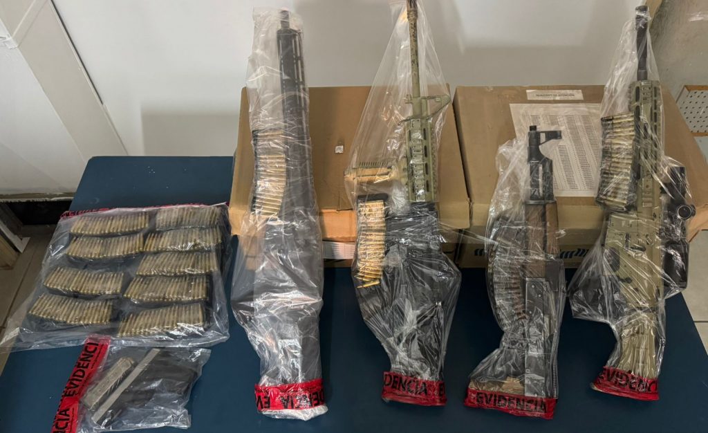 Durante la revisión del vehículo, los agentes localizaron una 1 pistola calibre .40 marca Smith & Wesson con un cargador abastecido con 11 cartuchos útiles, 4 armas largas, incluidas un fusil Norinco Mak 90 calibre 7.62×39 y un fusil sin marca y matrícula, 14 cargadores y un total de 335 cartuchos de diferentes calibres.