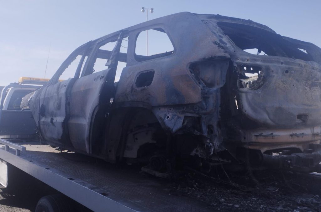 Una Jeep Cherokee modelo 2018, color guinda, sin placas de circulación y completamente calcinada, presuntamente involucrada en actividades ilícitas.