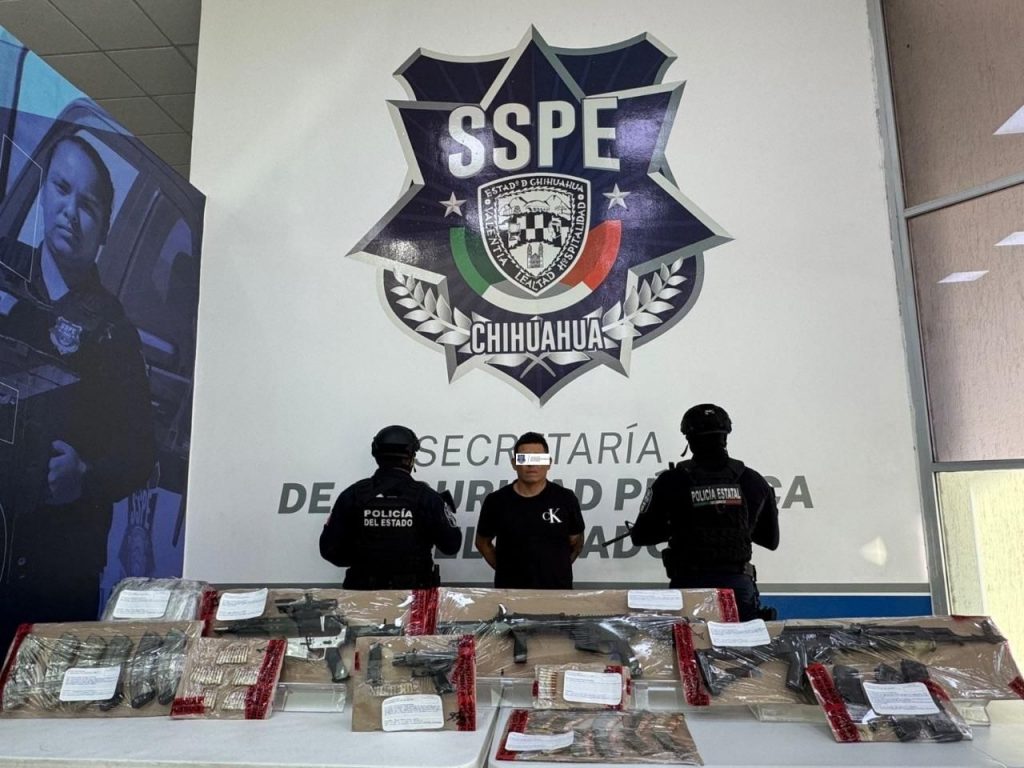 Elementos de la Secretaría de Seguridad Pública del Estado (SSPE), adscritos a la Subsecretaría de Despliegue Policial, lograron la detención de un hombre identificado como Juan Carlos L. de 34 años, en posesión de un arsenal y un vehículo con matrículas alteradas, tras una persecución aérea y terrestre registrada en la carretera al poblado El Pajarito.
