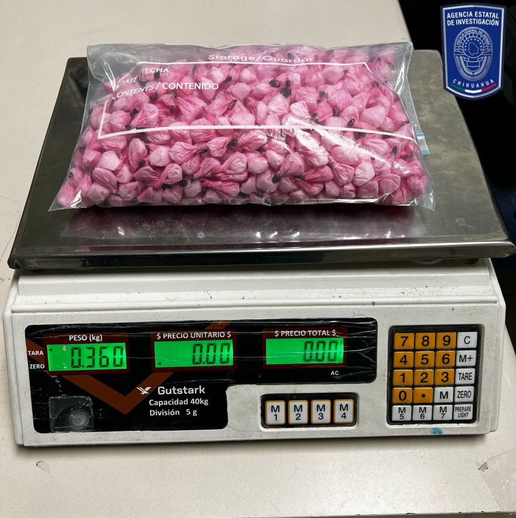 - 733 envoltorios de plástico en color rosa que contienen una sustancia granulada y cristalina con las características propias de la metanfetamina, dando un peso total 360 gramos.
