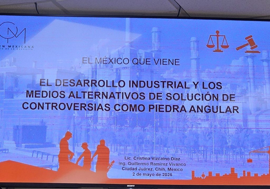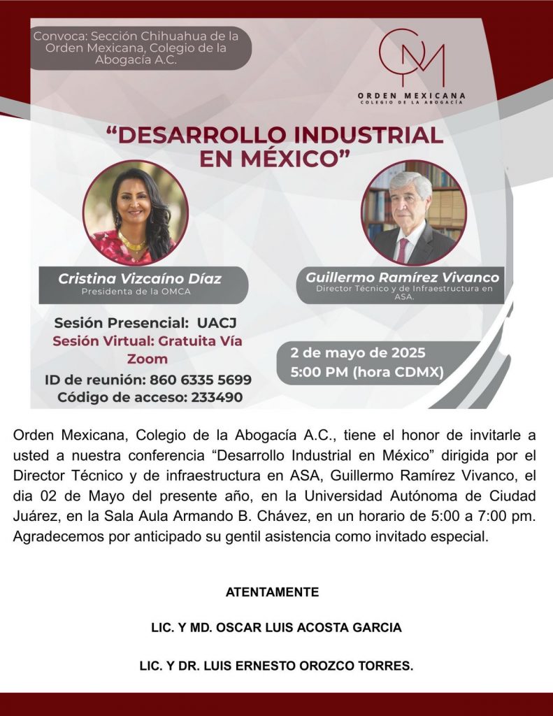 La Orden Mexicana Colegio de Abogacia A.C., OMCA,sostuvo una reunión especial en el Instituto de Ciencias Sociales y Administración, en el aula Alberto B Chávez de la Universidad Autónoma de Ciudad Juárez, a la Conferencia denominada : “ Desarrollo industrial en México.” Impartida por el Disertante : Guillermo Ramírez Vivanco.