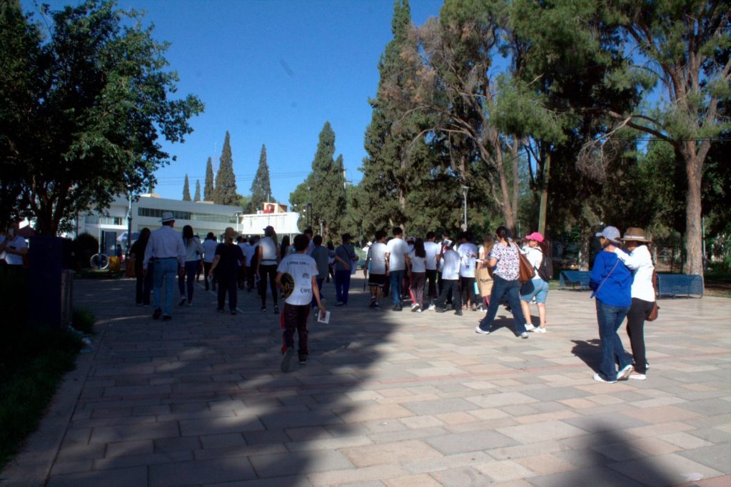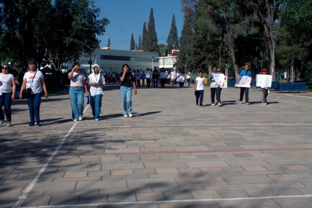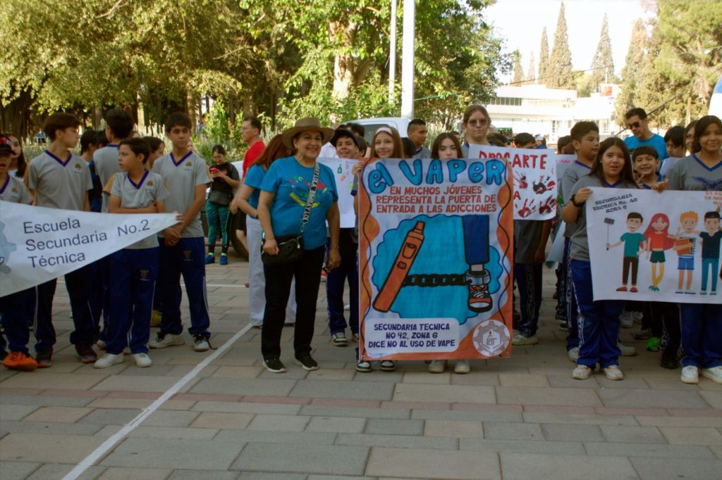 Al evento asistieron alumnos de cinco secundarias, quienes portaron carteles con mensajes preventivos y participaron en una activación física como preámbulo a una caminata de concientización contra las adicciones, algunos de ellos, acompañados por sus familias.