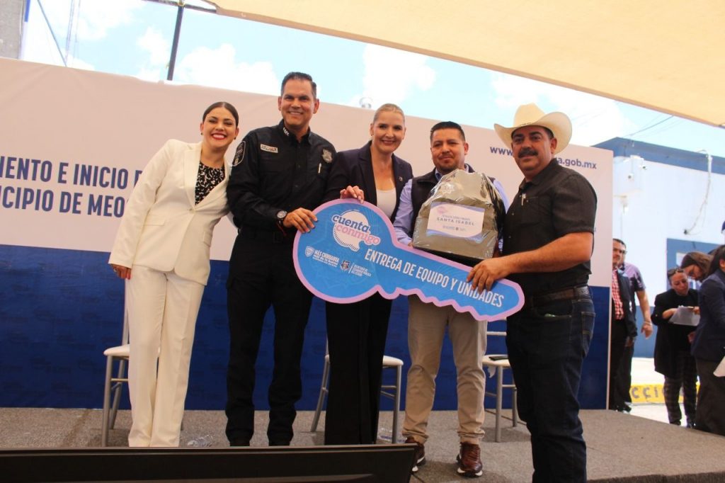 En este evento, el municipio de Meoqui recibió 3 patrullas, uniformes completos, cámaras de solapa, equipo antimotín, computadoras, entre otros artículos, con una inversión de más de 9.4 millones de pesos.