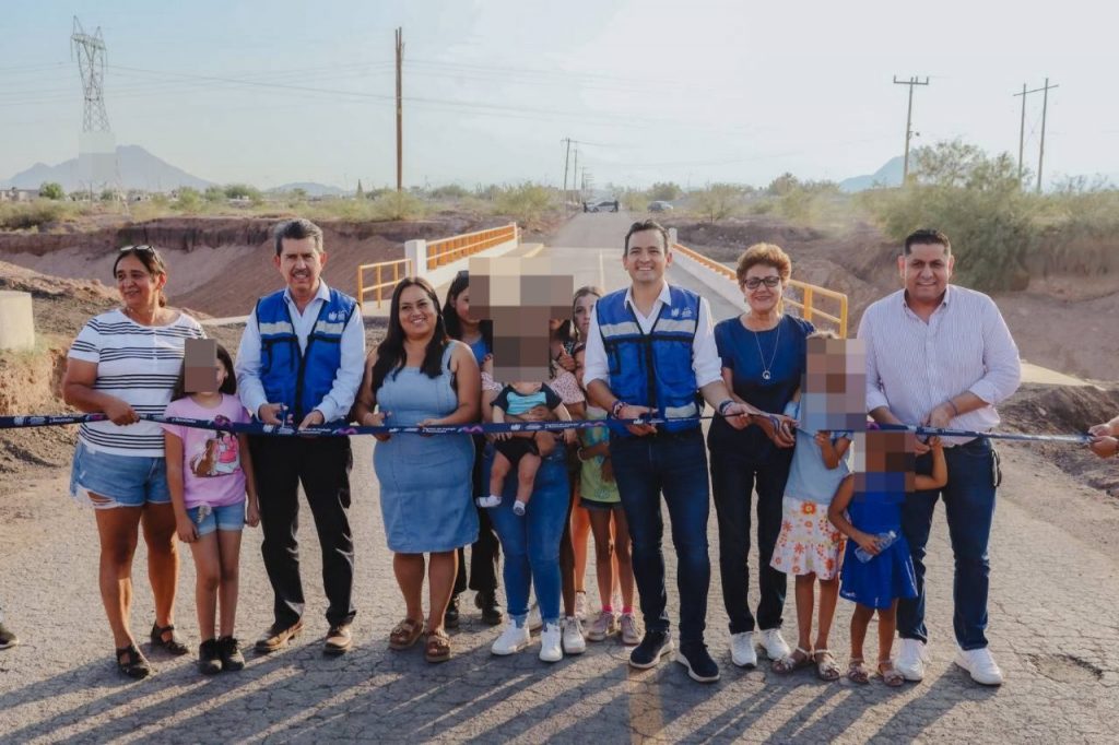 El corte de listón del puente vehicular que cruza por el arroyo Los Nogales, estuvo a cargo del alcalde Marco Bonilla, el director de Obras Públicas, Rodolfo Armendáriz, la coordinadora del comité de vecinos Rosa Irene Álvarez y los regidores Eva América Mayagoitía y Félix Martínez, así como los vecinos de este sector.