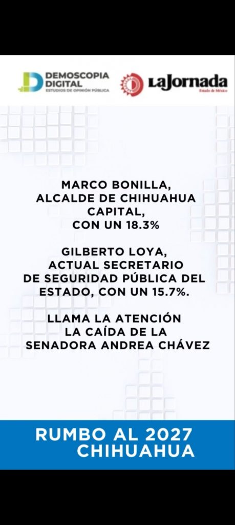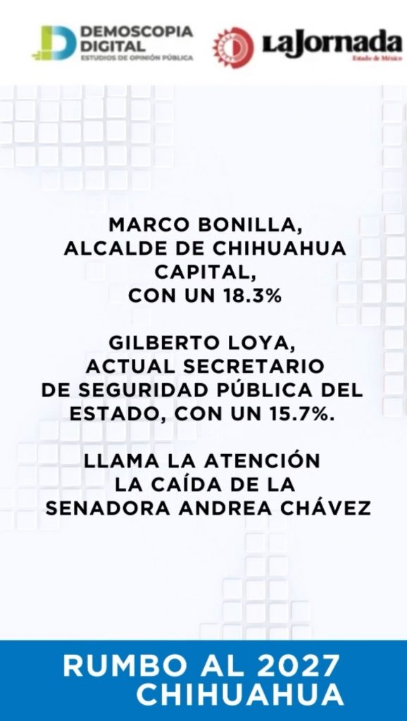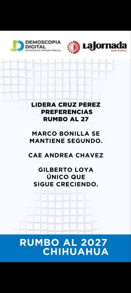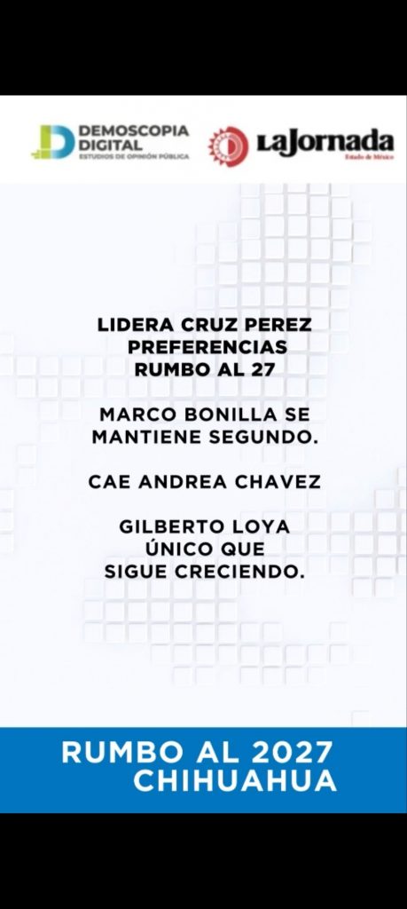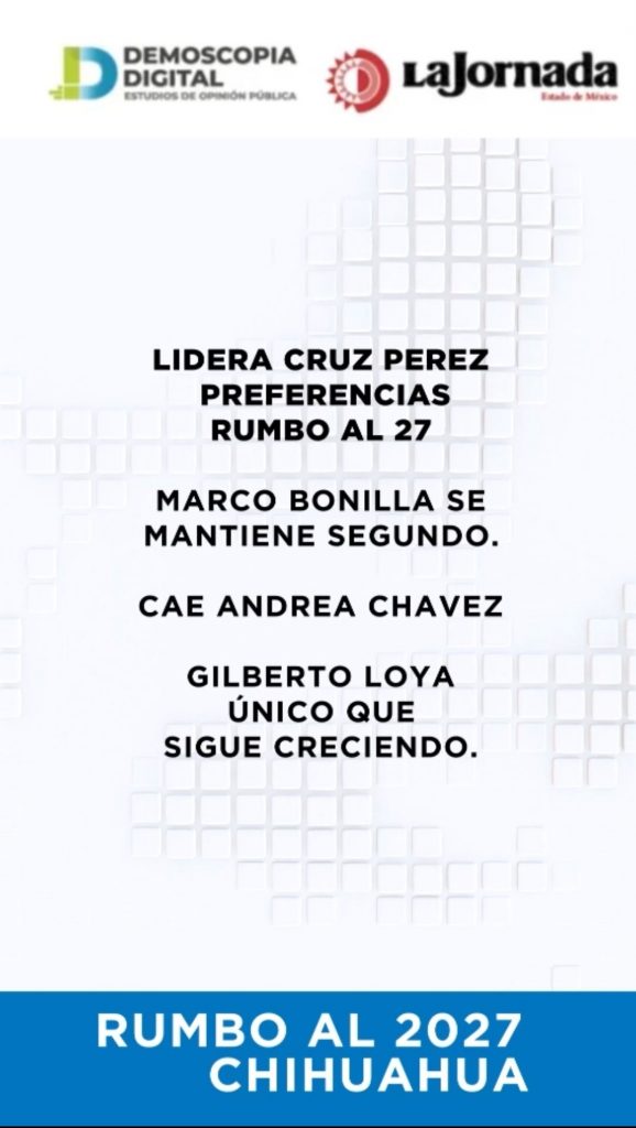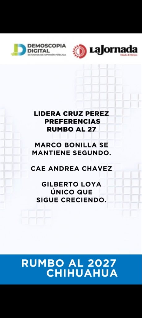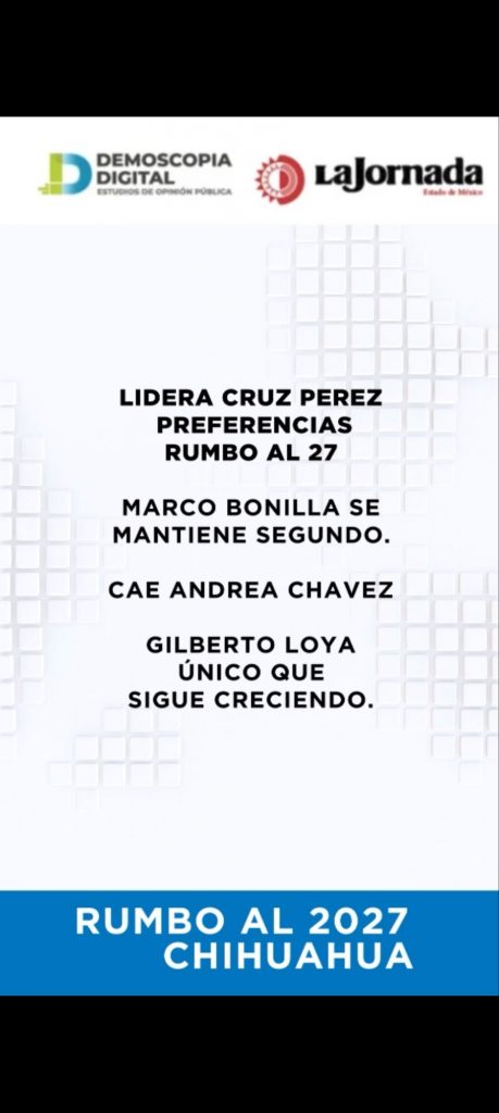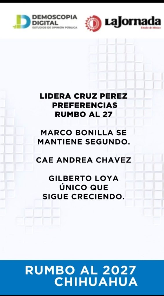 De acuerdo a la encuesta emitida por Demoscopia Digital, el alcalde de Ciudad Juárez, Cruz Pérez Cuéllar sigue encabezado las preferencias hacia la elección por la gubernatura en 2027 con un 32 por ciento de las preferencias.