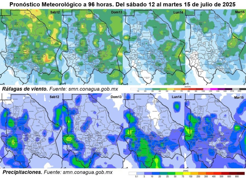 Para este día se pronostican precipitaciones con acumulados de 50.1 a 75 milímetros (mm), en la Sierra Tarahumara, además de lluvias dispersas en gran parte del territorio estatal.