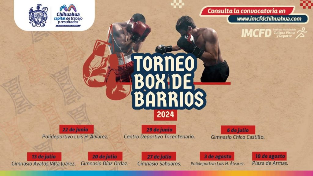 Chihuahua, Chih. A 20 de junio de 2024.- Este sábado 22 de junio sonará el “campanazo” inicial del Torneo “Box de Barrios”, que organiza el Gobierno Municipal de Chihuahua a través del Instituto Municipal de Cultura Física y Deporte en colaboración con el Comité Municipal de Boxeo, que se desarrollará durante ocho sábados consecutivos.