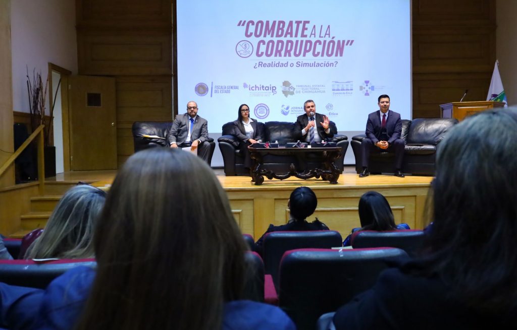 La Fiscalía General del Estado (FGE) en coordinación con el Instituto Chihuahuense para la Transparencia y Acceso a la Información Pública (ICHITAIP) y el Tribunal Estatal Electoral (TEE ) a través de sus grupos de ética, realizaron con motivo del Día Internacional contra la Corrupción el conversatorio “Combate a la Corrupción ¿Realidad o Simulación?”, en el que participaron Sergio Rafael Facio Guzmán, Comisionado Presidente del ICHITAIP; Francisco Acosta Molina, Magistrado Presidente de Tribunal de Disciplina Judicial; y, Hugo Molina Martínez, Magistrado Presidente del TEE y como moderadora Analí Escobedo Urrutia.
