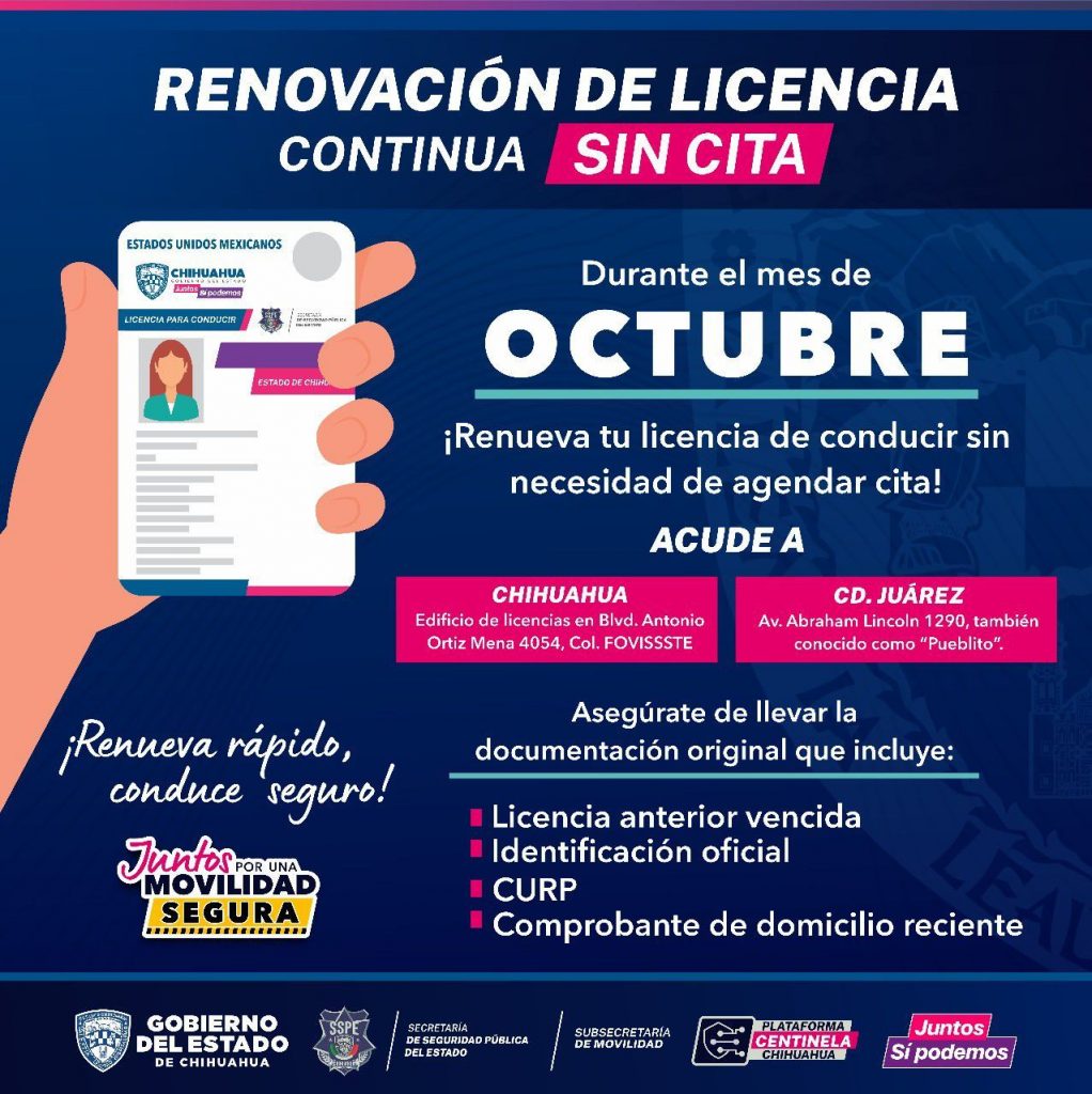 Para llevar a cabo este trámite, los interesados deberán presentarse en el edificio de licencias, ubicado en Blvd. Antonio Ortiz Mena 4054, Col. FOVISSSTE en Chihuahua capital, o bien, en Ciudad Juárez, en Av. Abraham Lincoln 1290, conocido como “Pueblito Mexicano”. Asimismo, en el resto del estado se podrá acudir a los módulos más cercanos.