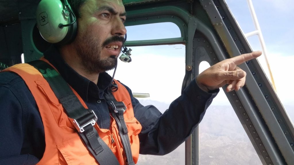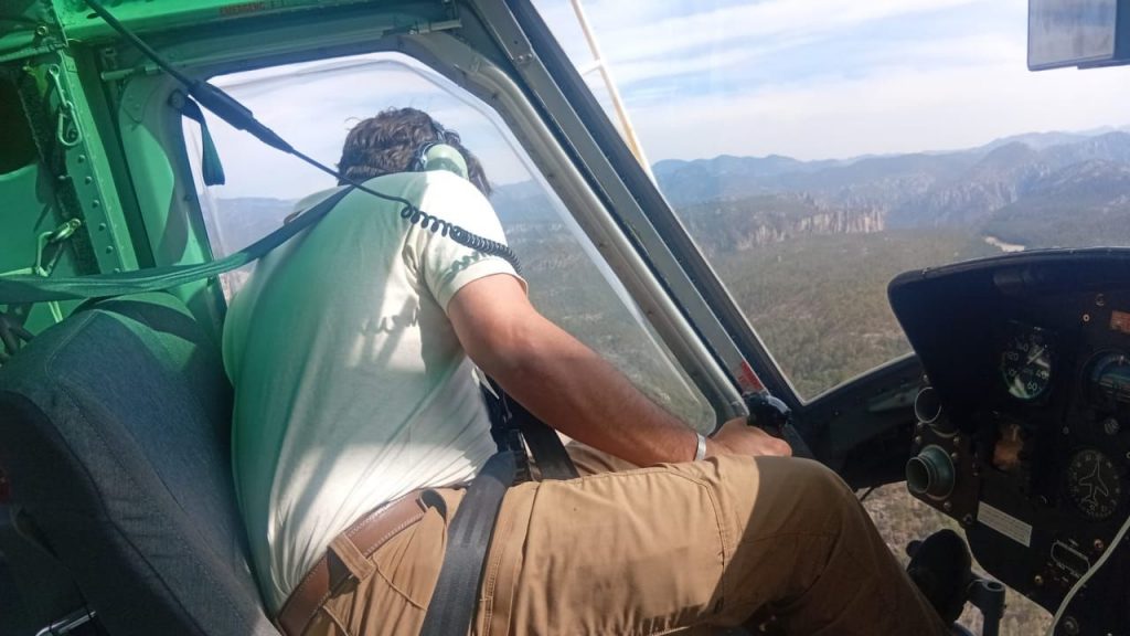 Personal operativo de la Coordinación Estatal de Protección Civil (CEPC), realiza evaluaciones para identificar en Moris, puntos estratégicos que permitan abastecer de combustible y recursos esenciales, al helicóptero destinado al combate de incendios forestales.