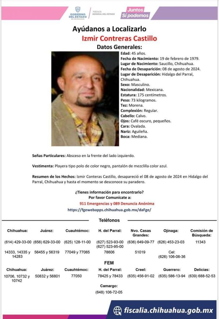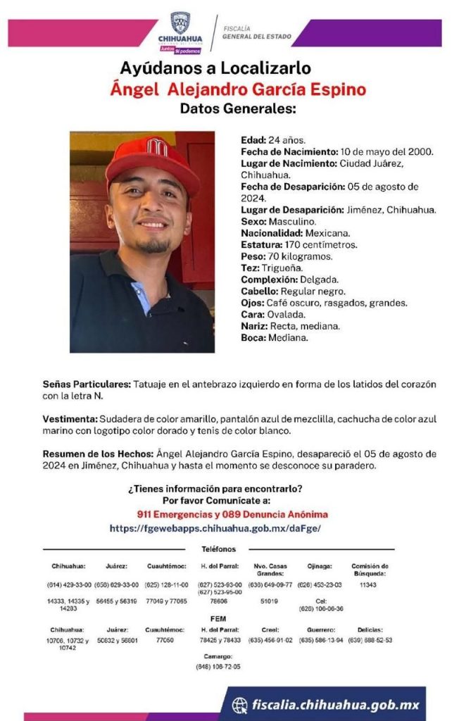 Izmir Contreras Castillo es originario del municipio de Saucillo y fue reportado como desaparecido el 08 de agosto del presente año en la ciudad de Parral, mientras que Ángel Alejandro García Espino, originario de Ciudad Juárez, desapareció el 05 de agosto en Jiménez.
