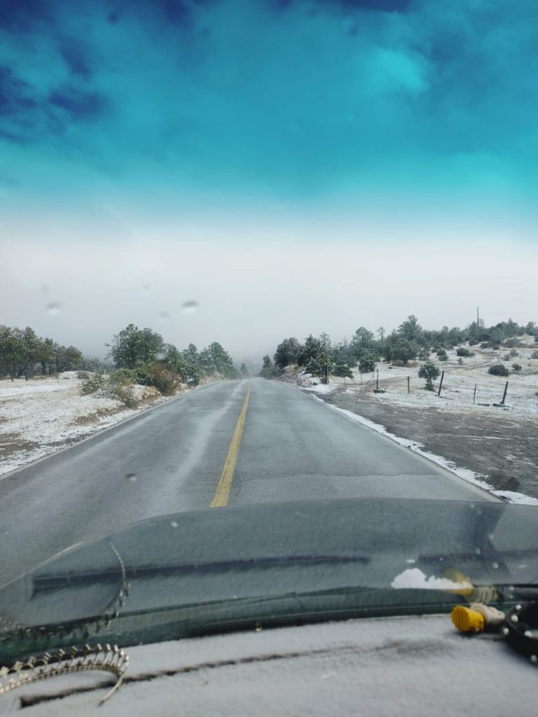 El tramo carretero Casas Grandes–El Willy, conocido como “El Caracol”, permanece abierto; sin embargo, se recomienda circular con precaución debido a la humedad y presencia de nieve sobre la cinta asfáltica.