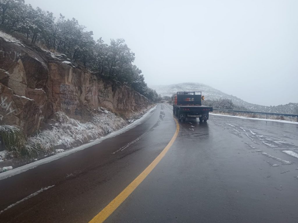 En Gómez Farías se presentó nieve ligera, sin embargo el tramo Gómez Farías–Namiquipa, en la zona conocida como La Cuesta del Toro, sigue abierto a la circulación.