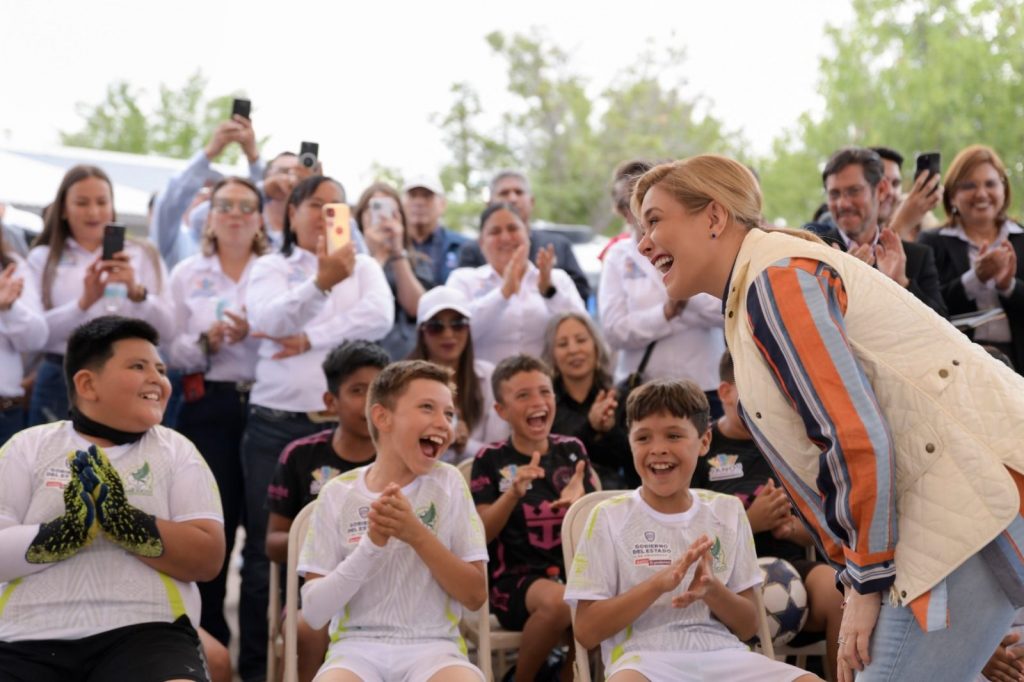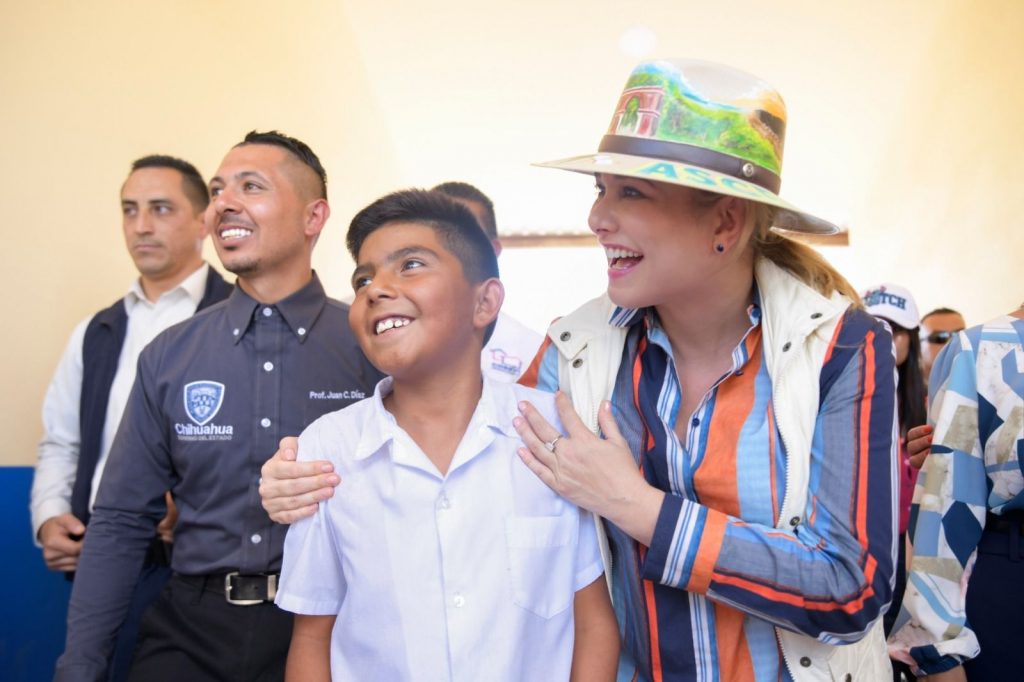En Janos, con una «cascarita» la mandataria inauguró una cancha de futbol 7×7 con pasto sintético en la escuela Porfirio Talamantes, donde además distribuyó mobiliario educativo para otros 10 planteles, como butacas, pizarrones, aires, tinacos y luminarias.