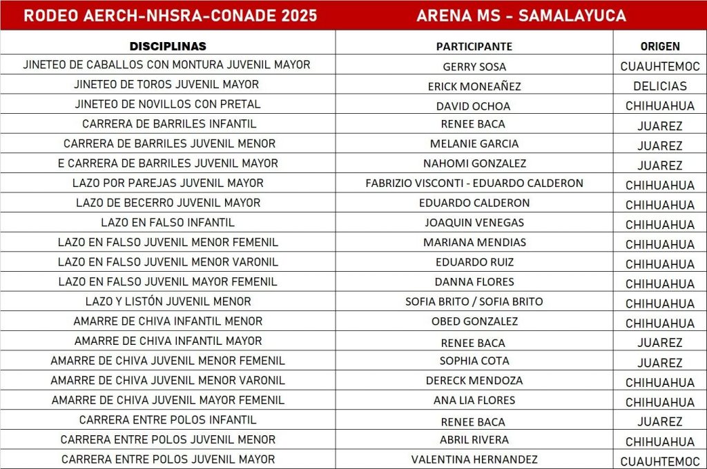 Dispuestos a dejarlo todo en pos del triunfo en sus respectivas disciplinas, 130 jinetes y amazonas de diversas zonas de la entidad, veinte de ellos juarenses, inundaron de emoción, adrenalina y pasión, el rodeo de la Arena MS en Samalayuca, Chihuahua, sede de la segunda etapa del selectivo estatal juvenil CONADE, a fines del mes anterior.