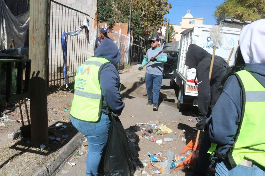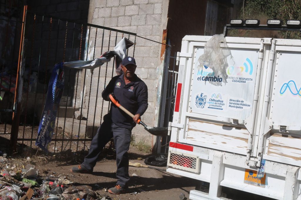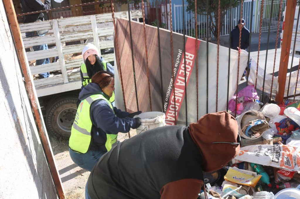 Con el objetivo de mantener una buena imagen urbana, el Gobierno Municipal, a través de la Dirección de Servicios Públicos Municipales, llevó a cabo la limpieza de una vivienda en la colonia Saucito con una gran acumulación de basura en el frente.