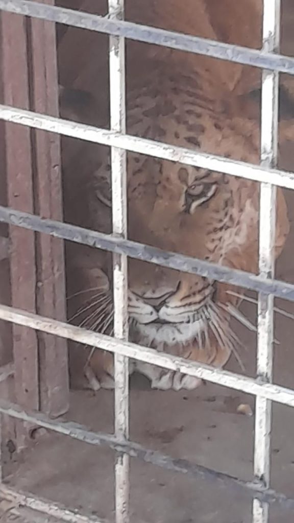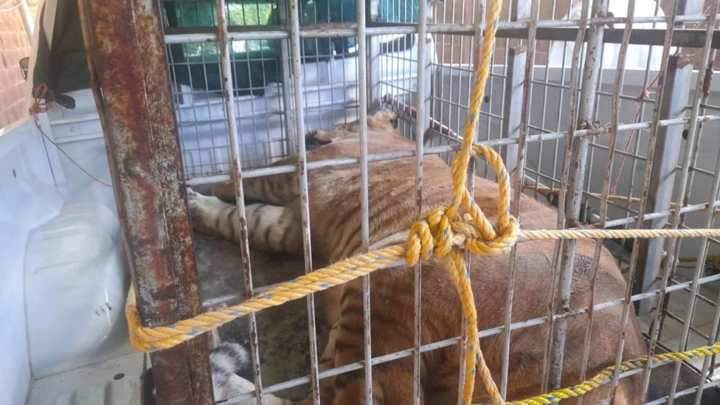 En el patio de una de las viviendas, encontraron un felino cruza de un león con una tigresa, de una edad promedio de un año dos meses, estaba dentro de una jaula, aparentemente en buenas condiciones de salud.
