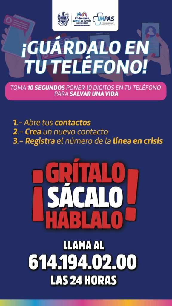 Para acceder a la “Línea de Atención en Crisis”, la cual es de uso en caso de emergencias, marca al número (614) 194-02-00, donde un psicólogo profesional atenderá la llamada a fin prevenir que puedan llegar al suicidio.