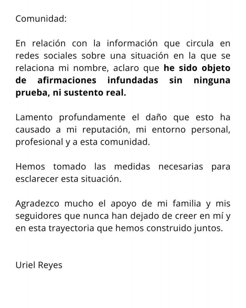 El youtuber Uriel Reyes se pronunció en sus redes sociales para defenderse en relación a lo que califica como afirmaciones infundadas en su contra.